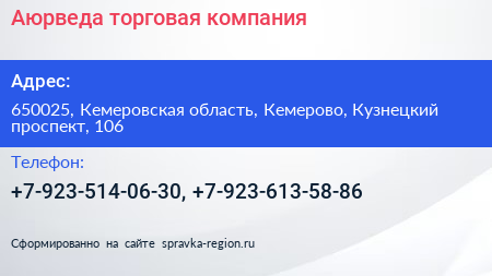 Аюрведа, торговая компания по адресу 650025, Кемеровская область, Кемерово, Кузнецкий проспект, 106 в дальнейшем Организация, размещена в следующих категориях: