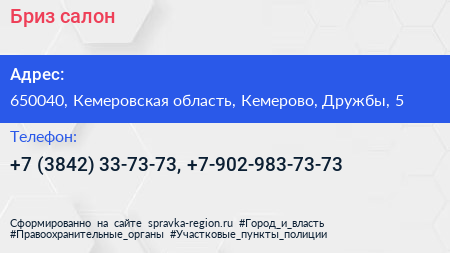 Бриз, салон по адресу 650040, Кемеровская область, Кемерово, Дружбы, 5 в дальнейшем Организация, размещена в следующих категориях: