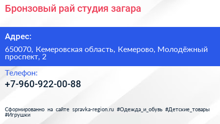 Бронзовый рай, студия загара по адресу 650070, Кемеровская область, Кемерово, Молодёжный проспект, 2 в дальнейшем Организация, размещена в следующих категориях: