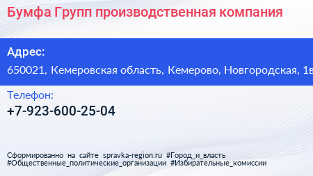 Бумфа Групп, производственная компания по адресу 650021, Кемеровская область, Кемерово, Новгородская, 1в в дальнейшем Организация, размещена в следующих категориях: