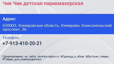 Чик-Чик, детская парикмахерская по адресу 650003, Кемеровская область, Кемерово, Комсомольский проспект, 36 в дальнейшем Организация, размещена в следующих категориях: