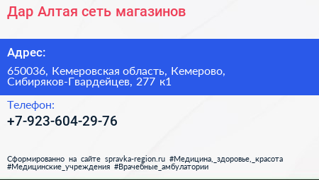 Дар Алтая, сеть магазинов по адресу 650036, Кемеровская область, Кемерово, Сибиряков-Гвардейцев, 277 к1 в дальнейшем Организация, размещена в следующих категориях: