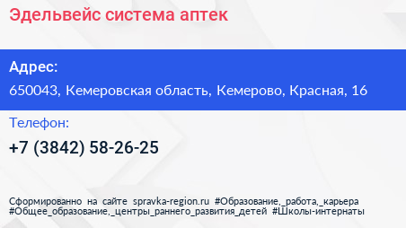 Эдельвейс, система аптек по адресу 650043, Кемеровская область, Кемерово, Красная, 16 в дальнейшем Организация, размещена в следующих категориях:
