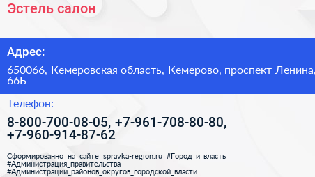 Эстель, салон по адресу 650066, Кемеровская область, Кемерово, проспект Ленина, 66Б в дальнейшем Организация, размещена в следующих категориях: