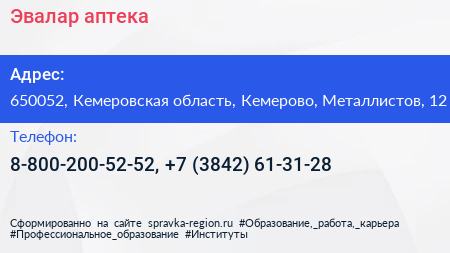 Эвалар, аптека по адресу 650052, Кемеровская область, Кемерово, Металлистов, 12 в дальнейшем Организация, размещена в следующих категориях: