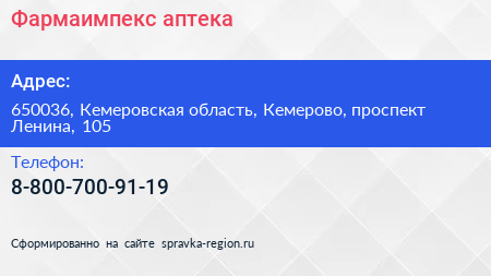 Фармаимпекс, аптека по адресу 650036, Кемеровская область, Кемерово, проспект Ленина, 105 в дальнейшем Организация, размещена в следующих категориях: