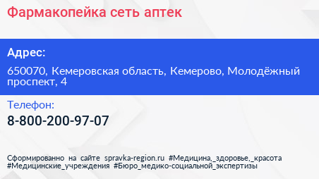 Фармакопейка, сеть аптек по адресу 650070, Кемеровская область, Кемерово, Молодёжный проспект, 4 в дальнейшем Организация, размещена в следующих категориях: