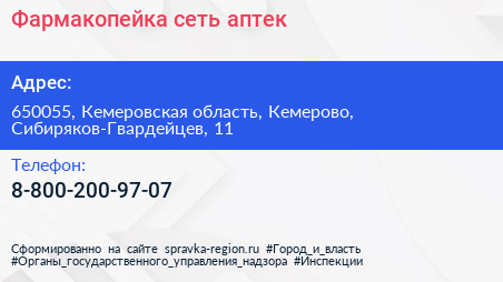 Фармакопейка, сеть аптек по адресу 650055, Кемеровская область, Кемерово, Сибиряков-Гвардейцев, 11 в дальнейшем Организация, размещена в следующих категориях: