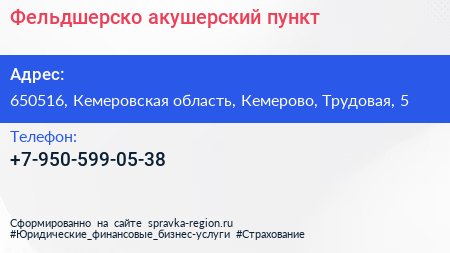 Фельдшерско-акушерский пункт по адресу 650516, Кемеровская область, Кемерово, Трудовая, 5 в дальнейшем Организация, размещена в следующих категориях: