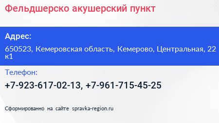 Фельдшерско-акушерский пункт по адресу 650523, Кемеровская область, Кемерово, Центральная, 22 к1 в дальнейшем Организация, размещена в следующих категориях: