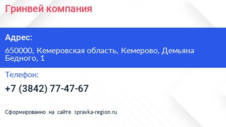 Гринвей, компания по адресу 650000, Кемеровская область, Кемерово, Демьяна Бедного, 1 в дальнейшем Организация, размещена в следующих категориях: