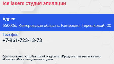Ice & lasers, студия эпиляции по адресу 650036, Кемеровская область, Кемерово, Терешковой, 30 в дальнейшем Организация, размещена в следующих категориях: