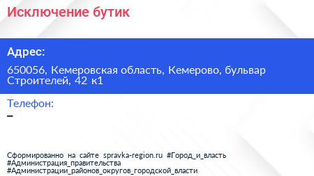 Исключение, бутик по адресу 650056, Кемеровская область, Кемерово, бульвар Строителей, 42 к1 в дальнейшем Организация, размещена в следующих категориях: