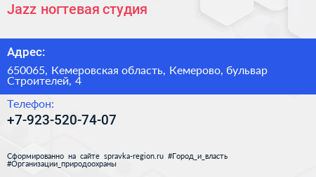 Jazz, ногтевая студия по адресу 650065, Кемеровская область, Кемерово, бульвар Строителей, 4 в дальнейшем Организация, размещена в следующих категориях: