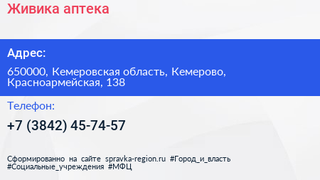 Живика, аптека по адресу 650000, Кемеровская область, Кемерово, Красноармейская, 138 в дальнейшем Организация, размещена в следующих категориях: