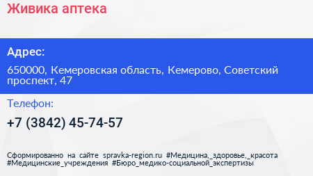 Живика, аптека по адресу 650000, Кемеровская область, Кемерово, Советский проспект, 47 в дальнейшем Организация, размещена в следующих категориях: