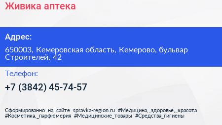 Живика, аптека по адресу 650003, Кемеровская область, Кемерово, бульвар Строителей, 42 в дальнейшем Организация, размещена в следующих категориях: