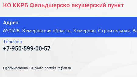 КО ККРБ, Фельдшерско-акушерский пункт по адресу 650528, Кемеровская область, Кемерово, Строительная, 9а в дальнейшем Организация, размещена в следующих категориях: