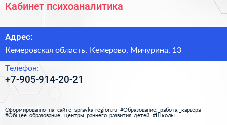 Кабинет психоаналитика по адресу Кемеровская область, Кемерово, Мичурина, 13 в дальнейшем Организация, размещена в следующих категориях: