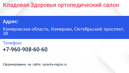 Кладовая Здоровья, ортопедический салон по адресу Кемеровская область, Кемерово, Октябрьский проспект, 28 в дальнейшем Организация, размещена в следующих категориях: