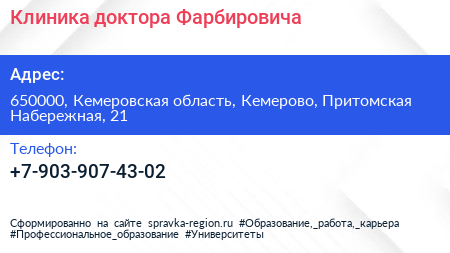 Клиника доктора Фарбировича по адресу 650000, Кемеровская область, Кемерово, Притомская Набережная, 21 в дальнейшем Организация, размещена в следующих категориях: