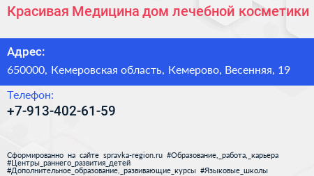 Красивая Медицина, дом лечебной косметики по адресу 650000, Кемеровская область, Кемерово, Весенняя, 19 в дальнейшем Организация, размещена в следующих категориях: