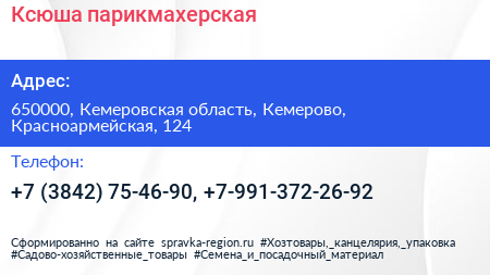 Ксюша, парикмахерская по адресу 650000, Кемеровская область, Кемерово, Красноармейская, 124 в дальнейшем Организация, размещена в следующих категориях: