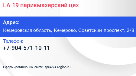 LA`19, парикмахерский цех по адресу Кемеровская область, Кемерово, Советский проспект, 2/8 в дальнейшем Организация, размещена в следующих категориях: