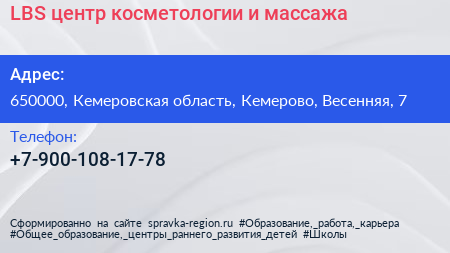 LBS, центр косметологии и массажа по адресу 650000, Кемеровская область, Кемерово, Весенняя, 7 в дальнейшем Организация, размещена в следующих категориях: