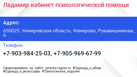 Ладамир, кабинет психологической помощи по адресу 650025, Кемеровская область, Кемерово, Рукавишникова, 6 в дальнейшем Организация, размещена в следующих категориях: