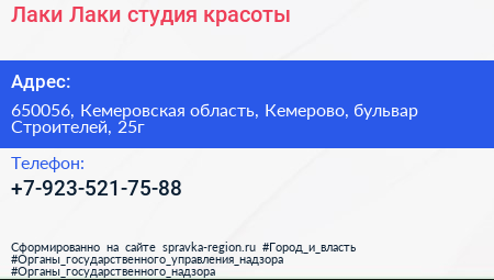 Лаки & Лаки, студия красоты по адресу 650056, Кемеровская область, Кемерово, бульвар Строителей, 25г в дальнейшем Организация, размещена в следующих категориях: