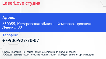 LaserLove, студия по адресу 650055, Кемеровская область, Кемерово, проспект Ленина, 33 в дальнейшем Организация, размещена в следующих категориях: