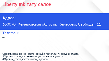 Liberty Ink, тату-салон по адресу 650070, Кемеровская область, Кемерово, Свободы, 11 в дальнейшем Организация, размещена в следующих категориях: