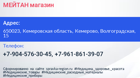 МЕЙТАН, магазин по адресу 650023, Кемеровская область, Кемерово, Волгоградская, 15 в дальнейшем Организация, размещена в следующих категориях: