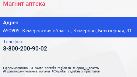 Магнит, аптека по адресу 650905, Кемеровская область, Кемерово, Белозёрная, 31 в дальнейшем Организация, размещена в следующих категориях: