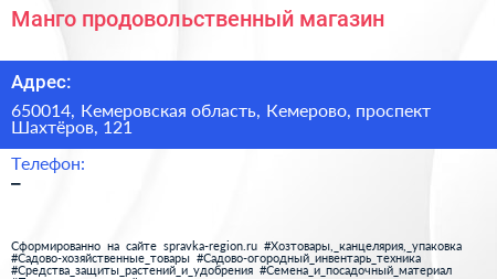 Манго, продовольственный магазин по адресу 650014, Кемеровская область, Кемерово, проспект Шахтёров, 121 в дальнейшем Организация, размещена в следующих категориях: