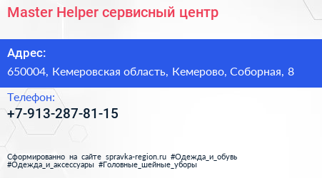 Master Helper, сервисный центр по адресу 650004, Кемеровская область, Кемерово, Соборная, 8 в дальнейшем Организация, размещена в следующих категориях: