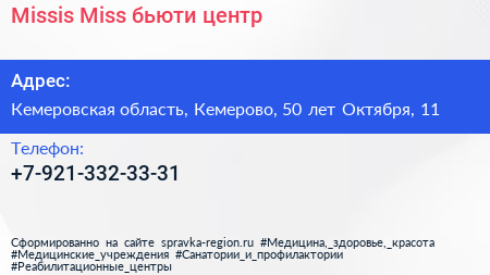 Missis & Miss, бьюти-центр по адресу Кемеровская область, Кемерово, 50 лет Октября, 11 в дальнейшем Организация, размещена в следующих категориях: