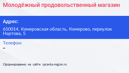 Молодёжный, продовольственный магазин по адресу 650014, Кемеровская область, Кемерово, переулок Нартова, 5 в дальнейшем Организация, размещена в следующих категориях: