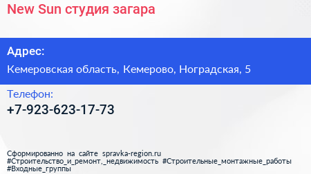 New Sun, студия загара по адресу Кемеровская область, Кемерово, Ноградская, 5 в дальнейшем Организация, размещена в следующих категориях:
