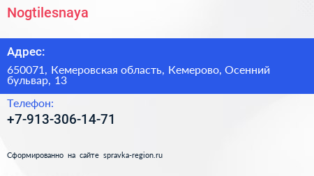Nogtilesnaya по адресу 650071, Кемеровская область, Кемерово, Осенний бульвар, 13 в дальнейшем Организация, размещена в следующих категориях: