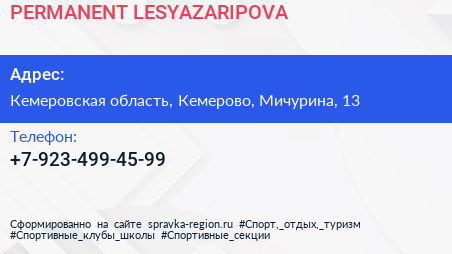 PERMANENT. LESYAZARIPOVA по адресу Кемеровская область, Кемерово, Мичурина, 13 в дальнейшем Организация, размещена в следующих категориях: