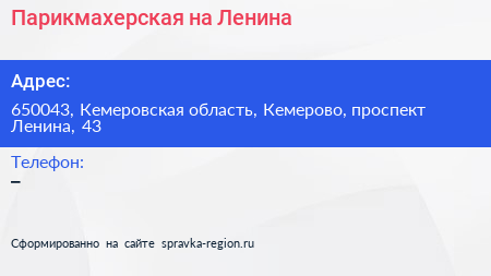 Парикмахерская на Ленина по адресу 650043, Кемеровская область, Кемерово, проспект Ленина, 43 в дальнейшем Организация, размещена в следующих категориях: