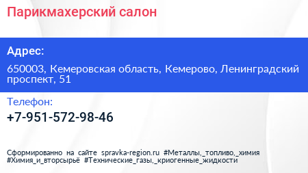 Парикмахерский салон по адресу 650003, Кемеровская область, Кемерово, Ленинградский проспект, 51 в дальнейшем Организация, размещена в следующих категориях: