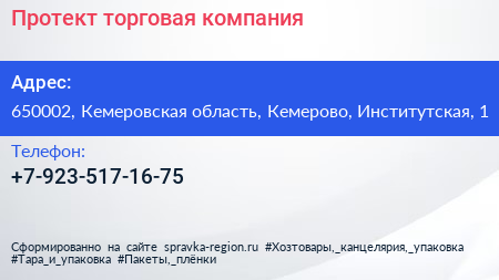 Протект, торговая компания по адресу 650002, Кемеровская область, Кемерово, Институтская, 1 в дальнейшем Организация, размещена в следующих категориях: