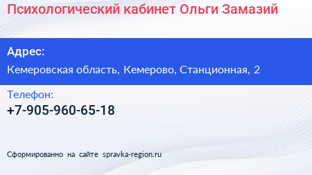 Психологический кабинет Ольги Замазий по адресу Кемеровская область, Кемерово, Станционная, 2 в дальнейшем Организация, размещена в следующих категориях: