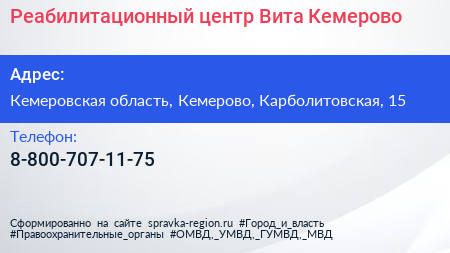 Реабилитационный центр Вита Кемерово по адресу Кемеровская область, Кемерово, Карболитовская, 15 в дальнейшем Организация, размещена в следующих категориях: