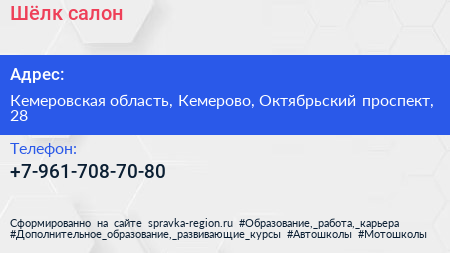 Шёлк, салон по адресу Кемеровская область, Кемерово, Октябрьский проспект, 28 в дальнейшем Организация, размещена в следующих категориях: