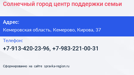 Солнечный город, центр поддержки семьи по адресу Кемеровская область, Кемерово, Кирова, 37 в дальнейшем Организация, размещена в следующих категориях: