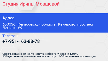 Студия Ирины Мовшевой по адресу 650036, Кемеровская область, Кемерово, проспект Ленина, 89 в дальнейшем Организация, размещена в следующих категориях: